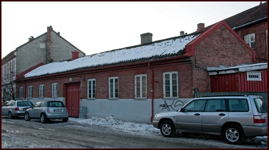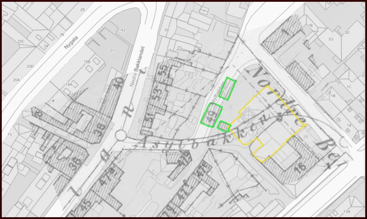 De tre bygningen størrelse og innbyrdes beliggenhet, tyder på at dette må være Nedre Bakklandet 49.