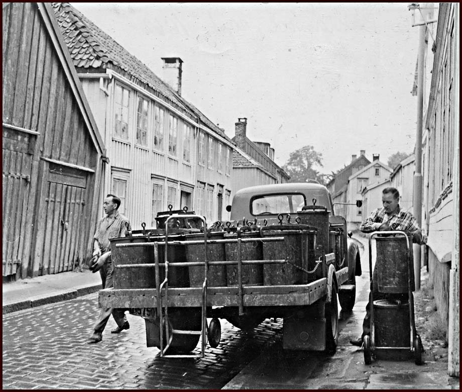 Dotømming på Nedre Bakklandet, i 1961. Personene på bildet er renholdsverkets Henrik Gimseng og Georg Sivertsen til høyre. (Foto: Ukjent ) Kilde: Trondheim Byarkiv