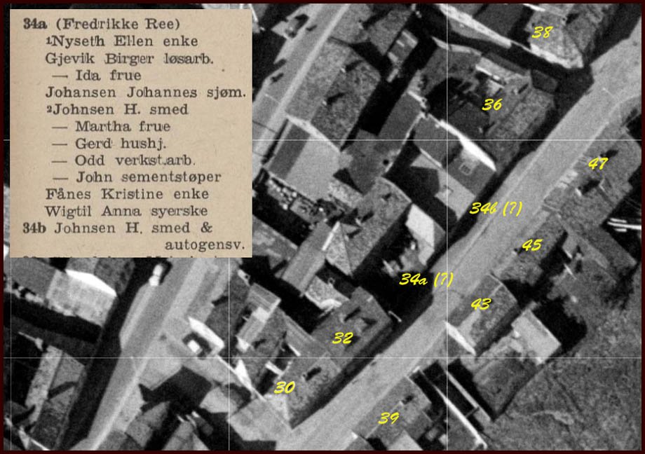 Det fremstår noe uklart hva som var 34a og hva som var 34b. Bakklandet.info tror det er som markert på bildet, men det er usikker informasjon. (Foto fra "1881 Kart" Historiske bilder, og Trondheim adressebok fra 1937)