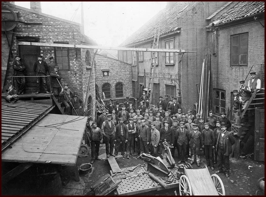 De fire "aktionærer" som startede Bakklandet Støberi & Mek Verksted. med kireklokker støpt for Lademoen Kirke. Ca. 1905 (Foto: Erik Olsen) Kilde: Jonas Chr. Richter. "Det gamle og det nye Trondhjem"