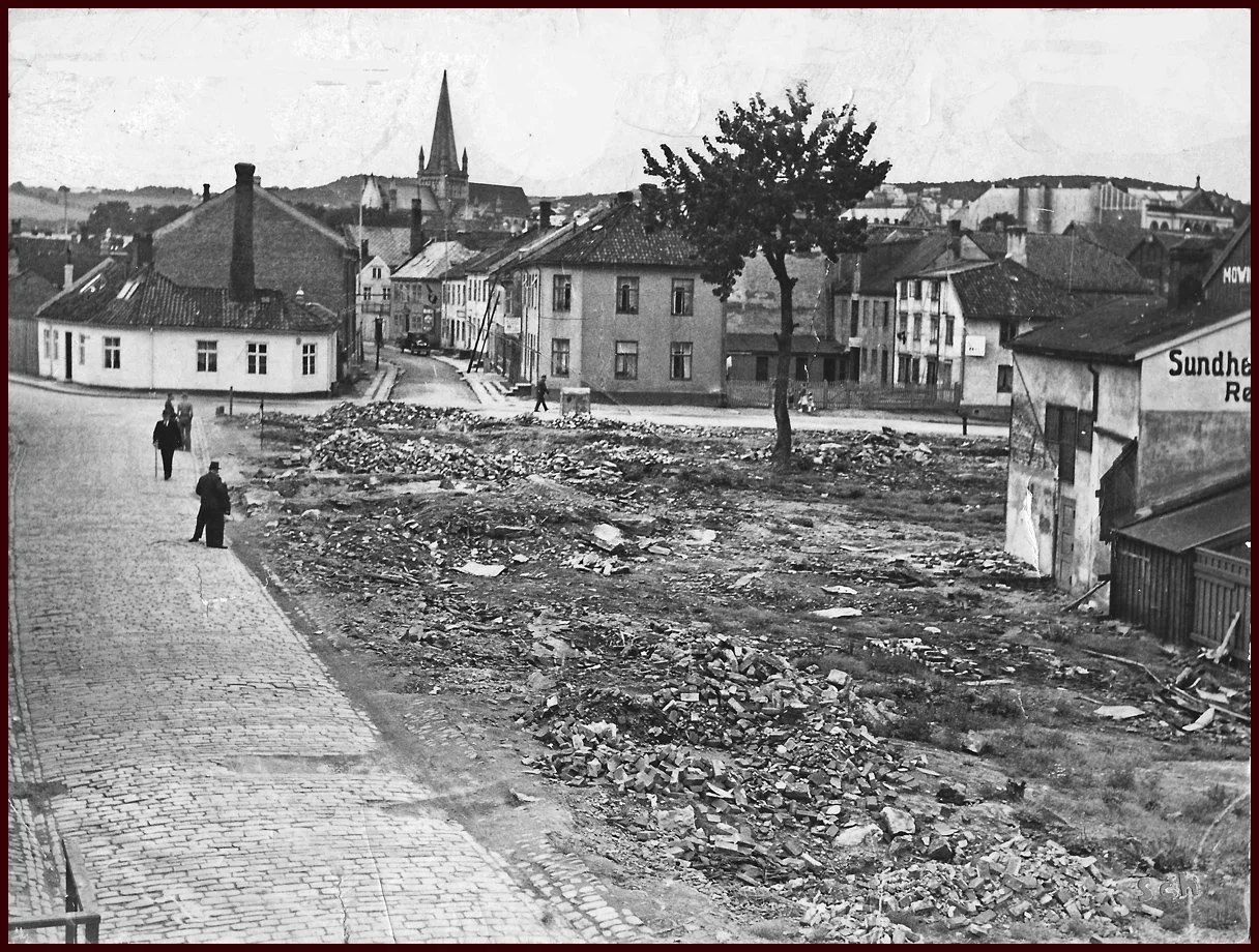 Her ser det ut til at husrekken Nedre Bakklandet 44 - 54 nylig er revet. De ble revet vinteren 1935-36, så da kan man nok med ganske stor sikkerhet datere dette bildet til 1936.