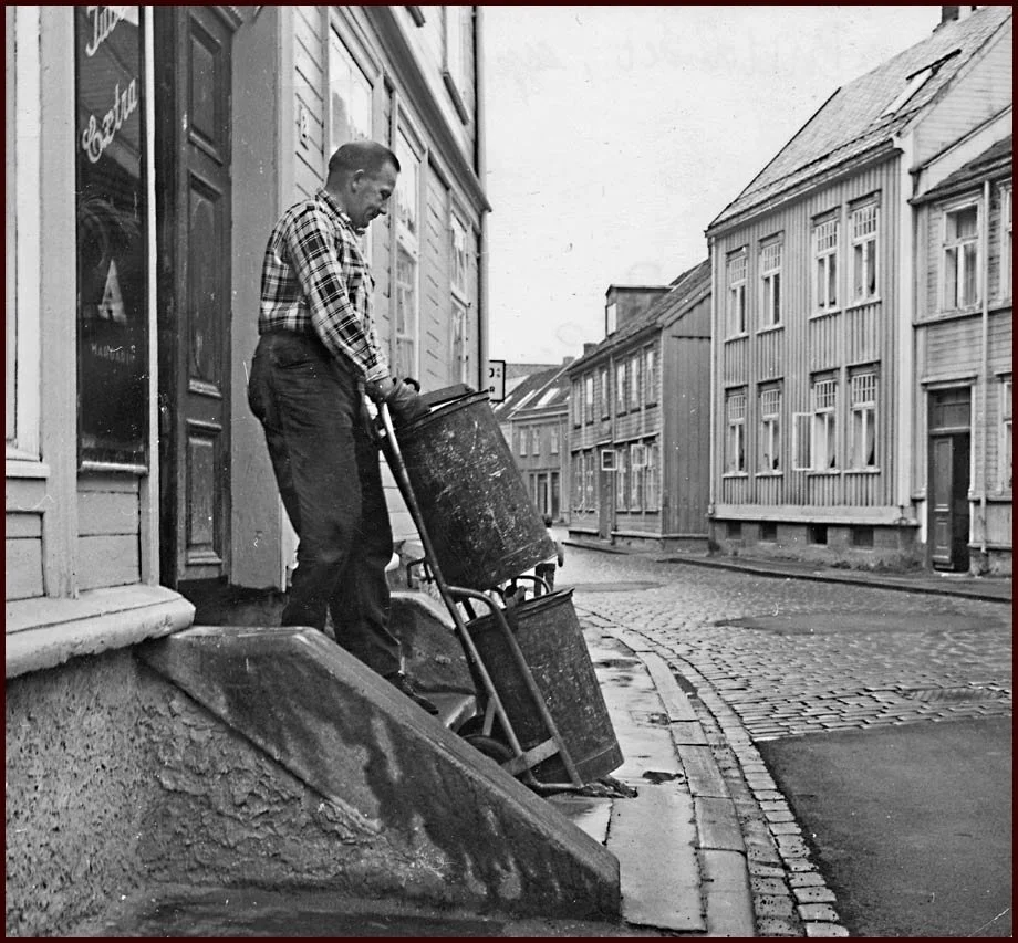 Dotømming på Nedre Bakklandet, i 1961. Personen på bildet er renholdsverkets Georg Sivertsen