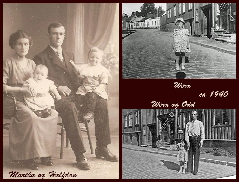 Wera er datter av Odd og Jenny (f. Grønning fra Trondheim), og Odd er sønn av Halvdan og Marta Jørgine (f. Jørgensen fra Ottersøy). (Foto: Ukjent, årstall for bildene til høyre ca. 1940, Kilde: Trond Arve Haakonsen) I bakgrunnen kan vi se at det var en kiosk i Nedre Bakklandet 45. Adressebok fra 1940 sier at både Bakklandet Brom og A.Larsen Frukt og Tobbakksforetning holdt til på denne adressen