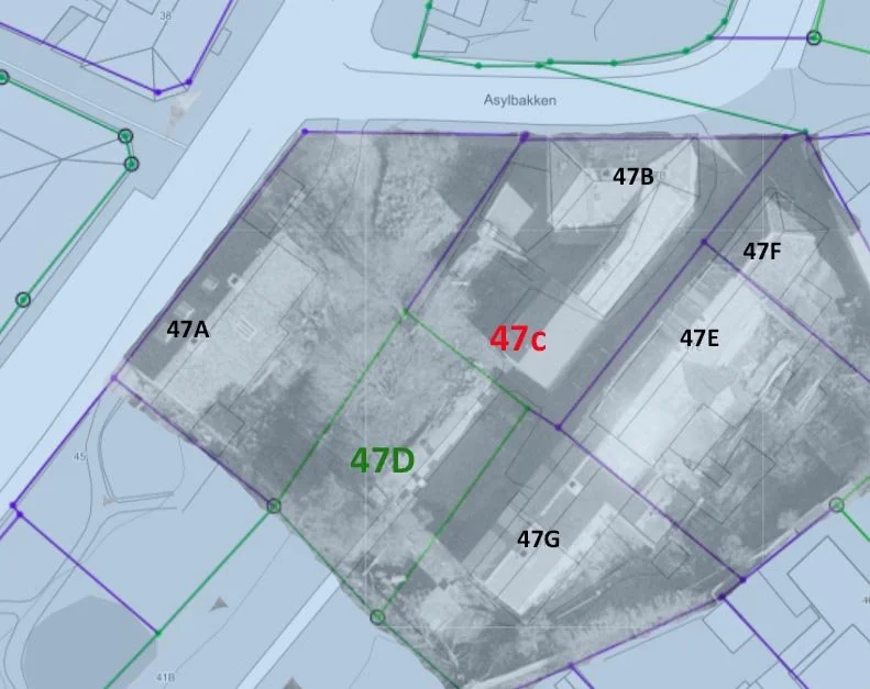 Nedre Bakklandet 47c kan vi se av flyfoto, var bebygd i 1986, men borte i 1991. Også på et kart fra 1904 er bygningen inntegnet. Har ikke lyktes å finne noe fotografi av huset, og er veldig interessert i å få fatt i det. Ta gjerne kontakt om du har, uansett kvalitet.