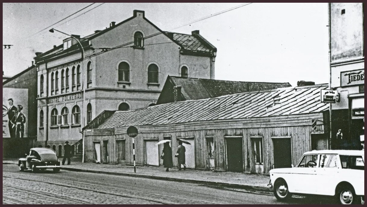 NB80: Østre Folkebad. Folkebadet var lokalisert her fordi befolkningen øst for elva i stor grad var fattig arbeiderklasse. De bodde gjerne i hus med dårlig sanitærforhold, og folkebadet hadde stor betydning for folkehelsen.