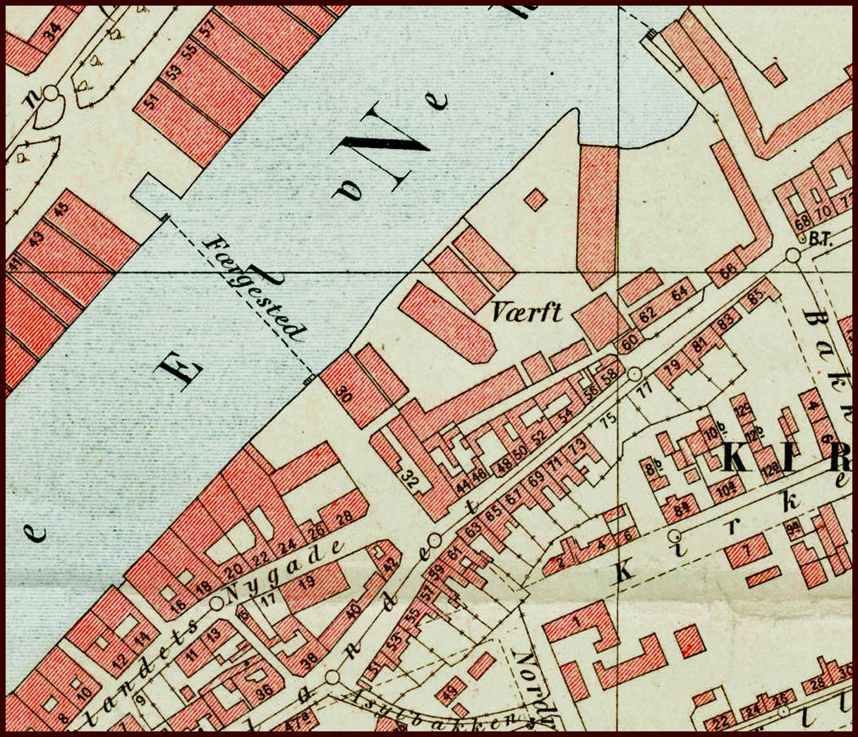 På kartet er det også av merket et fergested fra sentrum til NB30. Det var også er fergested litt lenger nord, der Bakke Bro er i dag.