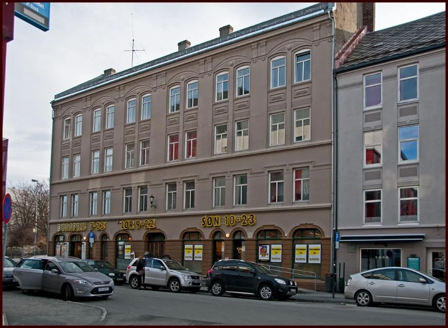 Nedre Bakklandet 77 hadde Dromedar (kaffebar) på gateplan venstre side, og en Frisør (Heidi?) til høyre.
