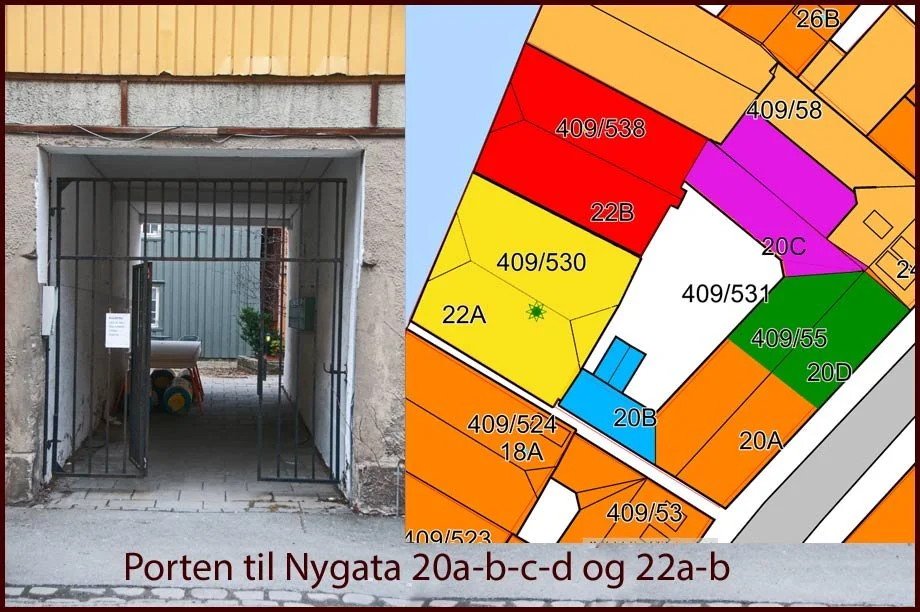 Porten i Nygata 20 fører inn til bakgården, og der finner vi Nygata 22a og b.
