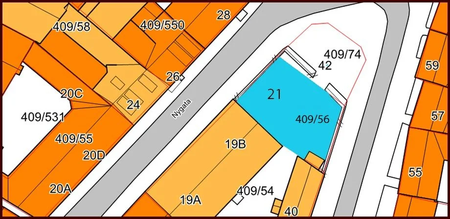 Nygata 21 er ubebygd, og fremstår som en inngjerdet del av Nygata 19 (Kart fra Trondheim Kommunes Karttjeneste)