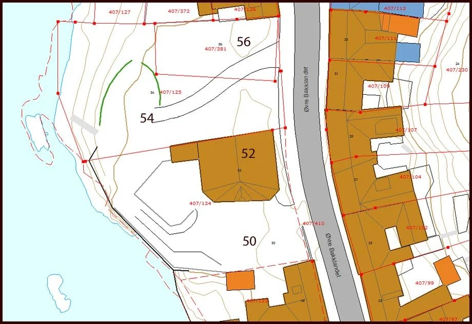 Øvre Bakklandet 50 er ubebygd, og fungerer som gårdsplass for Øvre Bakklandet 52 (Kart: Trondheim Kommune )