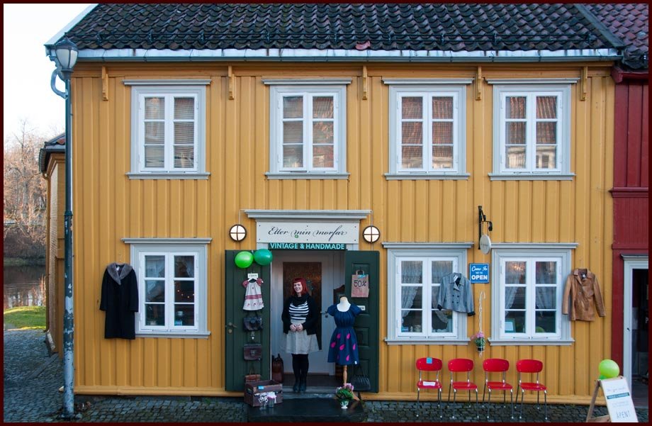 I første etasje hadde bruktbutikken “Etter min Morfar” tilhold. Driveren av butikken ble med på bildet, etter litt overtalelse….