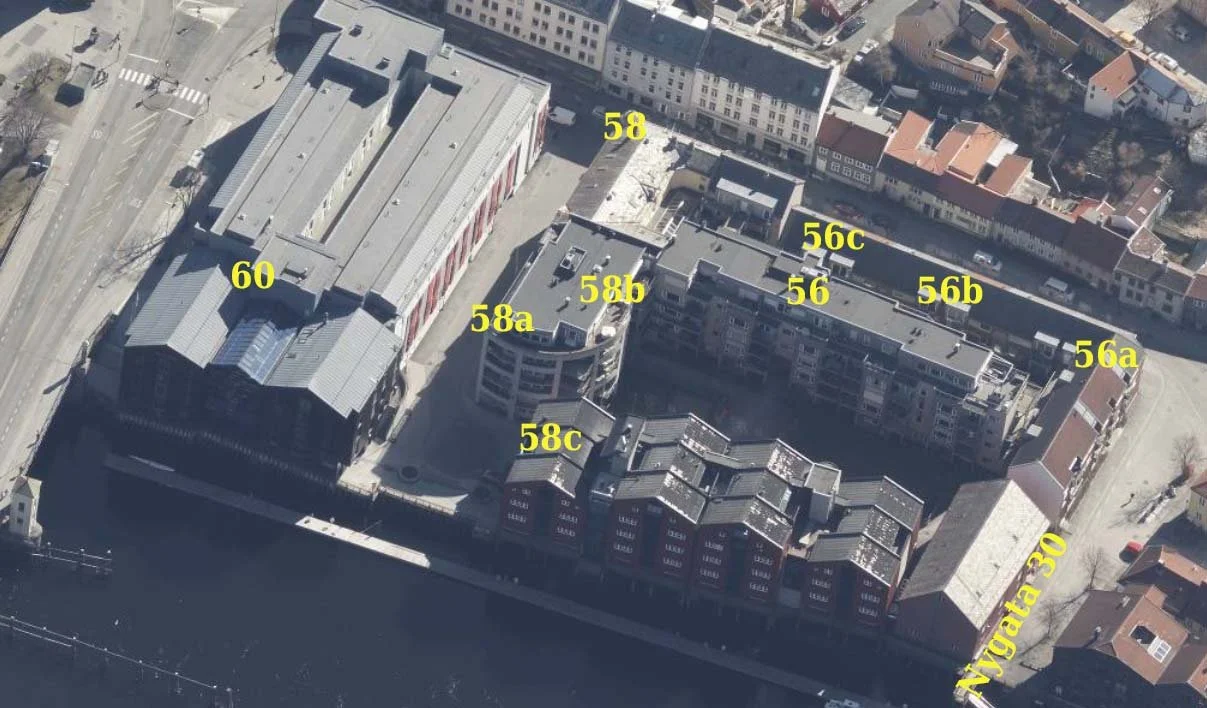 Nedre Bakklandet 52 var sannsynligvis det nærmeste huset på dette bildet. Ref kart under. Kartet er ikke orientert Nord-Sør, men i retning med bildet over ->